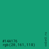 Цвет #14A176 в цветовой модели RGB обозначается тремя октетами (20, 161, 118) в десятичном формате и #14A176 в шестнадцатиричном (hex) формате, которые являются интенсивностью красного 20 (hex 14), интенсивность зелёного 161 (hex A1) и интенсивность синего 118 (hex 76).