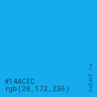 Цвет #14ACEC в цветовой модели RGB обозначается тремя октетами (20, 172, 236) в десятичном формате и #14ACEC в шестнадцатиричном (hex) формате, которые являются интенсивностью красного 20 (hex 14), интенсивность зелёного 172 (hex AC) и интенсивность синего 236 (hex EC).