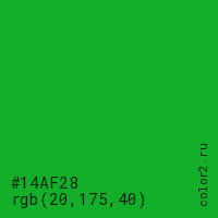 Цвет #14AF28 в цветовой модели RGB обозначается тремя октетами (20, 175, 40) в десятичном формате и #14AF28 в шестнадцатиричном (hex) формате, которые являются интенсивностью красного 20 (hex 14), интенсивность зелёного 175 (hex AF) и интенсивность синего 40 (hex 28).