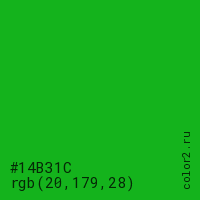 Цвет #14B31C в цветовой модели RGB обозначается тремя октетами (20, 179, 28) в десятичном формате и #14B31C в шестнадцатиричном (hex) формате, которые являются интенсивностью красного 20 (hex 14), интенсивность зелёного 179 (hex B3) и интенсивность синего 28 (hex 1C).