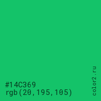 Цвет #14C369 в цветовой модели RGB обозначается тремя октетами (20, 195, 105) в десятичном формате и #14C369 в шестнадцатиричном (hex) формате, которые являются интенсивностью красного 20 (hex 14), интенсивность зелёного 195 (hex C3) и интенсивность синего 105 (hex 69).