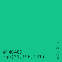 Цвет #14C48D в цветовой модели RGB обозначается тремя октетами (20, 196, 141) в десятичном формате и #14C48D в шестнадцатиричном (hex) формате, которые являются интенсивностью красного 20 (hex 14), интенсивность зелёного 196 (hex C4) и интенсивность синего 141 (hex 8D).