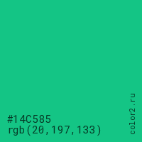 Цвет #14C585 в цветовой модели RGB обозначается тремя октетами (20, 197, 133) в десятичном формате и #14C585 в шестнадцатиричном (hex) формате, которые являются интенсивностью красного 20 (hex 14), интенсивность зелёного 197 (hex C5) и интенсивность синего 133 (hex 85).
