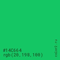 Цвет #14C664 в цветовой модели RGB обозначается тремя октетами (20, 198, 100) в десятичном формате и #14C664 в шестнадцатиричном (hex) формате, которые являются интенсивностью красного 20 (hex 14), интенсивность зелёного 198 (hex C6) и интенсивность синего 100 (hex 64).