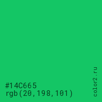 Цвет #14C665 в цветовой модели RGB обозначается тремя октетами (20, 198, 101) в десятичном формате и #14C665 в шестнадцатиричном (hex) формате, которые являются интенсивностью красного 20 (hex 14), интенсивность зелёного 198 (hex C6) и интенсивность синего 101 (hex 65).