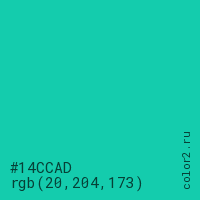 Цвет #14CCAD в цветовой модели RGB обозначается тремя октетами (20, 204, 173) в десятичном формате и #14CCAD в шестнадцатиричном (hex) формате, которые являются интенсивностью красного 20 (hex 14), интенсивность зелёного 204 (hex CC) и интенсивность синего 173 (hex AD).