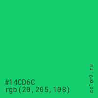Цвет #14CD6C в цветовой модели RGB обозначается тремя октетами (20, 205, 108) в десятичном формате и #14CD6C в шестнадцатиричном (hex) формате, которые являются интенсивностью красного 20 (hex 14), интенсивность зелёного 205 (hex CD) и интенсивность синего 108 (hex 6C).