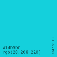 Цвет #14D0DC в цветовой модели RGB обозначается тремя октетами (20, 208, 220) в десятичном формате и #14D0DC в шестнадцатиричном (hex) формате, которые являются интенсивностью красного 20 (hex 14), интенсивность зелёного 208 (hex D0) и интенсивность синего 220 (hex DC).