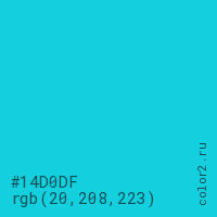 Цвет #14D0DF в цветовой модели RGB обозначается тремя октетами (20, 208, 223) в десятичном формате и #14D0DF в шестнадцатиричном (hex) формате, которые являются интенсивностью красного 20 (hex 14), интенсивность зелёного 208 (hex D0) и интенсивность синего 223 (hex DF).