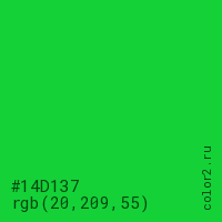 Цвет #14D137 в цветовой модели RGB обозначается тремя октетами (20, 209, 55) в десятичном формате и #14D137 в шестнадцатиричном (hex) формате, которые являются интенсивностью красного 20 (hex 14), интенсивность зелёного 209 (hex D1) и интенсивность синего 55 (hex 37).