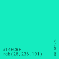Цвет #14ECBF в цветовой модели RGB обозначается тремя октетами (20, 236, 191) в десятичном формате и #14ECBF в шестнадцатиричном (hex) формате, которые являются интенсивностью красного 20 (hex 14), интенсивность зелёного 236 (hex EC) и интенсивность синего 191 (hex BF).