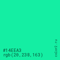 Цвет #14EEA3 в цветовой модели RGB обозначается тремя октетами (20, 238, 163) в десятичном формате и #14EEA3 в шестнадцатиричном (hex) формате, которые являются интенсивностью красного 20 (hex 14), интенсивность зелёного 238 (hex EE) и интенсивность синего 163 (hex A3).
