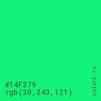 Цвет #14F379 в цветовой модели RGB обозначается тремя октетами (20, 243, 121) в десятичном формате и #14F379 в шестнадцатиричном (hex) формате, которые являются интенсивностью красного 20 (hex 14), интенсивность зелёного 243 (hex F3) и интенсивность синего 121 (hex 79).