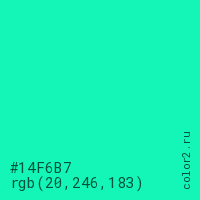 Цвет #14F6B7 в цветовой модели RGB обозначается тремя октетами (20, 246, 183) в десятичном формате и #14F6B7 в шестнадцатиричном (hex) формате, которые являются интенсивностью красного 20 (hex 14), интенсивность зелёного 246 (hex F6) и интенсивность синего 183 (hex B7).