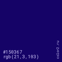 Цвет #150367 в цветовой модели RGB обозначается тремя октетами (21, 3, 103) в десятичном формате и #150367 в шестнадцатиричном (hex) формате, которые являются интенсивностью красного 21 (hex 15), интенсивность зелёного 3 (hex 03) и интенсивность синего 103 (hex 67).