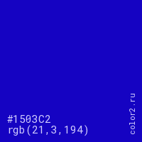 Цвет #1503C2 в цветовой модели RGB обозначается тремя октетами (21, 3, 194) в десятичном формате и #1503C2 в шестнадцатиричном (hex) формате, которые являются интенсивностью красного 21 (hex 15), интенсивность зелёного 3 (hex 03) и интенсивность синего 194 (hex C2).