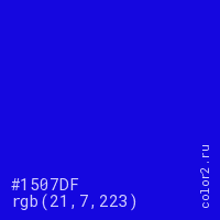 Цвет #1507DF в цветовой модели RGB обозначается тремя октетами (21, 7, 223) в десятичном формате и #1507DF в шестнадцатиричном (hex) формате, которые являются интенсивностью красного 21 (hex 15), интенсивность зелёного 7 (hex 07) и интенсивность синего 223 (hex DF).
