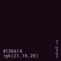 Цвет #150A14 в цветовой модели RGB обозначается тремя октетами (21, 10, 20) в десятичном формате и #150A14 в шестнадцатиричном (hex) формате, которые являются интенсивностью красного 21 (hex 15), интенсивность зелёного 10 (hex 0A) и интенсивность синего 20 (hex 14).