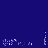 Цвет #150A76 в цветовой модели RGB обозначается тремя октетами (21, 10, 118) в десятичном формате и #150A76 в шестнадцатиричном (hex) формате, которые являются интенсивностью красного 21 (hex 15), интенсивность зелёного 10 (hex 0A) и интенсивность синего 118 (hex 76).
