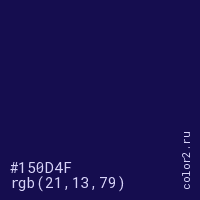 Цвет #150D4F в цветовой модели RGB обозначается тремя октетами (21, 13, 79) в десятичном формате и #150D4F в шестнадцатиричном (hex) формате, которые являются интенсивностью красного 21 (hex 15), интенсивность зелёного 13 (hex 0D) и интенсивность синего 79 (hex 4F).