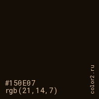 Цвет #150E07 в цветовой модели RGB обозначается тремя октетами (21, 14, 7) в десятичном формате и #150E07 в шестнадцатиричном (hex) формате, которые являются интенсивностью красного 21 (hex 15), интенсивность зелёного 14 (hex 0E) и интенсивность синего 7 (hex 07).