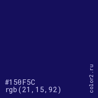 Цвет #150F5C в цветовой модели RGB обозначается тремя октетами (21, 15, 92) в десятичном формате и #150F5C в шестнадцатиричном (hex) формате, которые являются интенсивностью красного 21 (hex 15), интенсивность зелёного 15 (hex 0F) и интенсивность синего 92 (hex 5C).