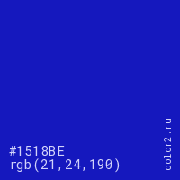 Цвет #1518BE в цветовой модели RGB обозначается тремя октетами (21, 24, 190) в десятичном формате и #1518BE в шестнадцатиричном (hex) формате, которые являются интенсивностью красного 21 (hex 15), интенсивность зелёного 24 (hex 18) и интенсивность синего 190 (hex BE).