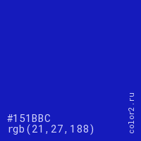 Цвет #151BBC в цветовой модели RGB обозначается тремя октетами (21, 27, 188) в десятичном формате и #151BBC в шестнадцатиричном (hex) формате, которые являются интенсивностью красного 21 (hex 15), интенсивность зелёного 27 (hex 1B) и интенсивность синего 188 (hex BC).