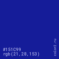 Цвет #151C99 в цветовой модели RGB обозначается тремя октетами (21, 28, 153) в десятичном формате и #151C99 в шестнадцатиричном (hex) формате, которые являются интенсивностью красного 21 (hex 15), интенсивность зелёного 28 (hex 1C) и интенсивность синего 153 (hex 99).