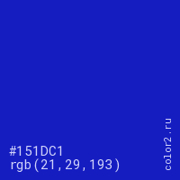 Цвет #151DC1 в цветовой модели RGB обозначается тремя октетами (21, 29, 193) в десятичном формате и #151DC1 в шестнадцатиричном (hex) формате, которые являются интенсивностью красного 21 (hex 15), интенсивность зелёного 29 (hex 1D) и интенсивность синего 193 (hex C1).