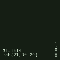 Цвет #151E14 в цветовой модели RGB обозначается тремя октетами (21, 30, 20) в десятичном формате и #151E14 в шестнадцатиричном (hex) формате, которые являются интенсивностью красного 21 (hex 15), интенсивность зелёного 30 (hex 1E) и интенсивность синего 20 (hex 14).