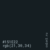 Цвет #151E22 в цветовой модели RGB обозначается тремя октетами (21, 30, 34) в десятичном формате и #151E22 в шестнадцатиричном (hex) формате, которые являются интенсивностью красного 21 (hex 15), интенсивность зелёного 30 (hex 1E) и интенсивность синего 34 (hex 22).