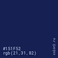 Цвет #151F52 в цветовой модели RGB обозначается тремя октетами (21, 31, 82) в десятичном формате и #151F52 в шестнадцатиричном (hex) формате, которые являются интенсивностью красного 21 (hex 15), интенсивность зелёного 31 (hex 1F) и интенсивность синего 82 (hex 52).