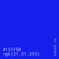 Цвет #151FEB в цветовой модели RGB обозначается тремя октетами (21, 31, 235) в десятичном формате и #151FEB в шестнадцатиричном (hex) формате, которые являются интенсивностью красного 21 (hex 15), интенсивность зелёного 31 (hex 1F) и интенсивность синего 235 (hex EB).
