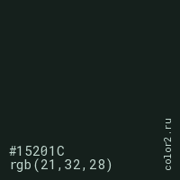 Цвет #15201C в цветовой модели RGB обозначается тремя октетами (21, 32, 28) в десятичном формате и #15201C в шестнадцатиричном (hex) формате, которые являются интенсивностью красного 21 (hex 15), интенсивность зелёного 32 (hex 20) и интенсивность синего 28 (hex 1C).