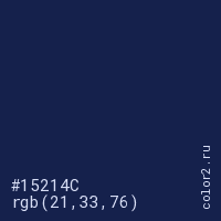 Цвет #15214C в цветовой модели RGB обозначается тремя октетами (21, 33, 76) в десятичном формате и #15214C в шестнадцатиричном (hex) формате, которые являются интенсивностью красного 21 (hex 15), интенсивность зелёного 33 (hex 21) и интенсивность синего 76 (hex 4C).