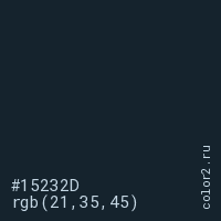 Цвет #15232D в цветовой модели RGB обозначается тремя октетами (21, 35, 45) в десятичном формате и #15232D в шестнадцатиричном (hex) формате, которые являются интенсивностью красного 21 (hex 15), интенсивность зелёного 35 (hex 23) и интенсивность синего 45 (hex 2D).