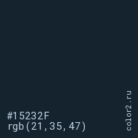 Цвет #15232F в цветовой модели RGB обозначается тремя октетами (21, 35, 47) в десятичном формате и #15232F в шестнадцатиричном (hex) формате, которые являются интенсивностью красного 21 (hex 15), интенсивность зелёного 35 (hex 23) и интенсивность синего 47 (hex 2F).