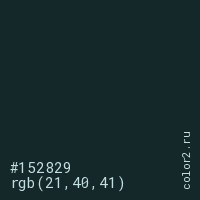 Цвет #152829 в цветовой модели RGB обозначается тремя октетами (21, 40, 41) в десятичном формате и #152829 в шестнадцатиричном (hex) формате, которые являются интенсивностью красного 21 (hex 15), интенсивность зелёного 40 (hex 28) и интенсивность синего 41 (hex 29).