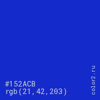 Цвет #152ACB в цветовой модели RGB обозначается тремя октетами (21, 42, 203) в десятичном формате и #152ACB в шестнадцатиричном (hex) формате, которые являются интенсивностью красного 21 (hex 15), интенсивность зелёного 42 (hex 2A) и интенсивность синего 203 (hex CB).