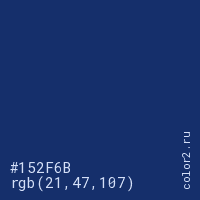 Цвет #152F6B в цветовой модели RGB обозначается тремя октетами (21, 47, 107) в десятичном формате и #152F6B в шестнадцатиричном (hex) формате, которые являются интенсивностью красного 21 (hex 15), интенсивность зелёного 47 (hex 2F) и интенсивность синего 107 (hex 6B).