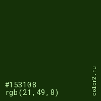 Цвет #153108 в цветовой модели RGB обозначается тремя октетами (21, 49, 8) в десятичном формате и #153108 в шестнадцатиричном (hex) формате, которые являются интенсивностью красного 21 (hex 15), интенсивность зелёного 49 (hex 31) и интенсивность синего 8 (hex 08).