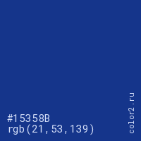 Цвет #15358B в цветовой модели RGB обозначается тремя октетами (21, 53, 139) в десятичном формате и #15358B в шестнадцатиричном (hex) формате, которые являются интенсивностью красного 21 (hex 15), интенсивность зелёного 53 (hex 35) и интенсивность синего 139 (hex 8B).