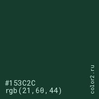Цвет #153C2C в цветовой модели RGB обозначается тремя октетами (21, 60, 44) в десятичном формате и #153C2C в шестнадцатиричном (hex) формате, которые являются интенсивностью красного 21 (hex 15), интенсивность зелёного 60 (hex 3C) и интенсивность синего 44 (hex 2C).