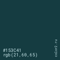 Цвет #153C41 в цветовой модели RGB обозначается тремя октетами (21, 60, 65) в десятичном формате и #153C41 в шестнадцатиричном (hex) формате, которые являются интенсивностью красного 21 (hex 15), интенсивность зелёного 60 (hex 3C) и интенсивность синего 65 (hex 41).