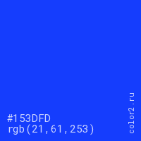 Цвет #153DFD в цветовой модели RGB обозначается тремя октетами (21, 61, 253) в десятичном формате и #153DFD в шестнадцатиричном (hex) формате, которые являются интенсивностью красного 21 (hex 15), интенсивность зелёного 61 (hex 3D) и интенсивность синего 253 (hex FD).