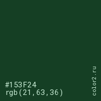 Цвет #153F24 в цветовой модели RGB обозначается тремя октетами (21, 63, 36) в десятичном формате и #153F24 в шестнадцатиричном (hex) формате, которые являются интенсивностью красного 21 (hex 15), интенсивность зелёного 63 (hex 3F) и интенсивность синего 36 (hex 24).