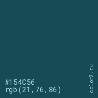 Цвет #154C56 в цветовой модели RGB обозначается тремя октетами (21, 76, 86) в десятичном формате и #154C56 в шестнадцатиричном (hex) формате, которые являются интенсивностью красного 21 (hex 15), интенсивность зелёного 76 (hex 4C) и интенсивность синего 86 (hex 56).