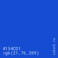 Цвет #154CD1 в цветовой модели RGB обозначается тремя октетами (21, 76, 209) в десятичном формате и #154CD1 в шестнадцатиричном (hex) формате, которые являются интенсивностью красного 21 (hex 15), интенсивность зелёного 76 (hex 4C) и интенсивность синего 209 (hex D1).