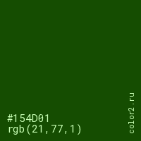 Цвет #154D01 в цветовой модели RGB обозначается тремя октетами (21, 77, 1) в десятичном формате и #154D01 в шестнадцатиричном (hex) формате, которые являются интенсивностью красного 21 (hex 15), интенсивность зелёного 77 (hex 4D) и интенсивность синего 1 (hex 01).